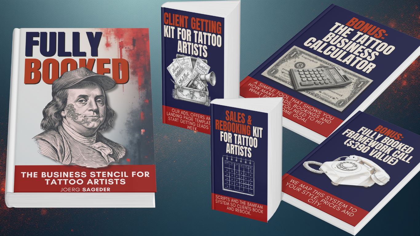 This is the exact system — book, ads, scripts, templates and calculators — we used to generate $500,000+ in tattoo deposits in our own shops this year.
